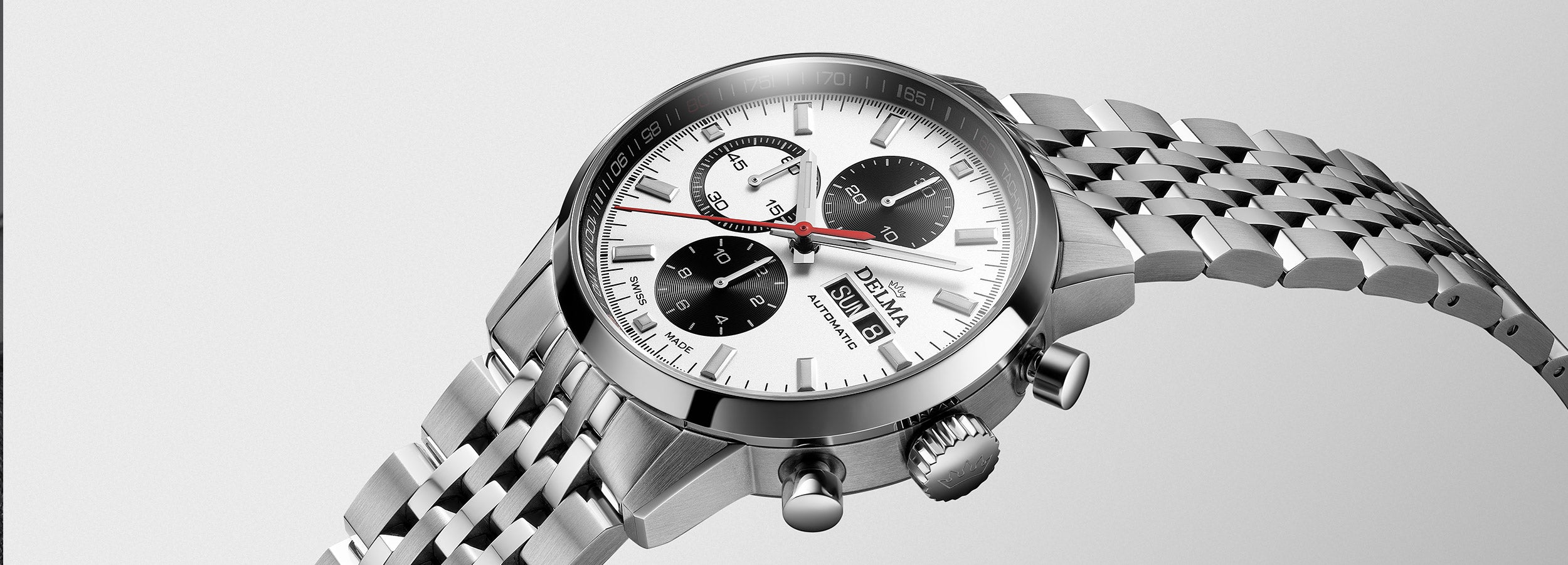 A sleek silhouette, sharp lines, and a mix of brushed and polished surfaces ensure a confident, comfortable fit. Vintage-inspired details include applied Super-LumiNova® C1 indexes, a tachymeter scale, a red central seconds hand, and refined crown and chronograph pushers. Set on a distinctive 7-link stainless steel bracelet with a butterfly clasp with pushers, with water resistance to 100 meters and a scratch-resistant sapphire crystal, the Continental is built to accompany you from city streets to seaside escapes.
