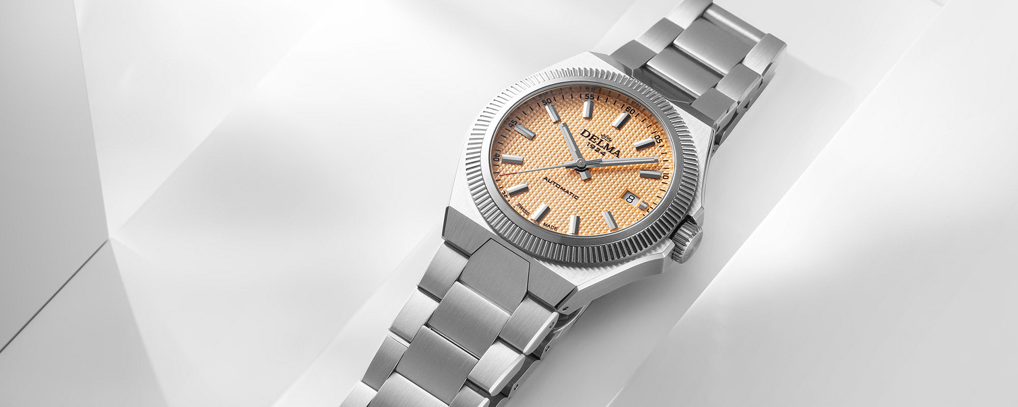 The 2024 Midland is based on a model bearing the same name from the 1980’s with a twist. The overall composition recalls the decade’s bold geometric forms with a new integrated bracelet that blends seamlessly with the tonneau shaped case. The addition of the fluted bezel adds a classic edge and contrast to the smooth brushed elements. The salmon dial is enhanced with a pyramid guilloche pattern. Appointed with applied baton indexes and hour and minute hands with Super-LumiNova BGW9, timing is always legible at a glance.