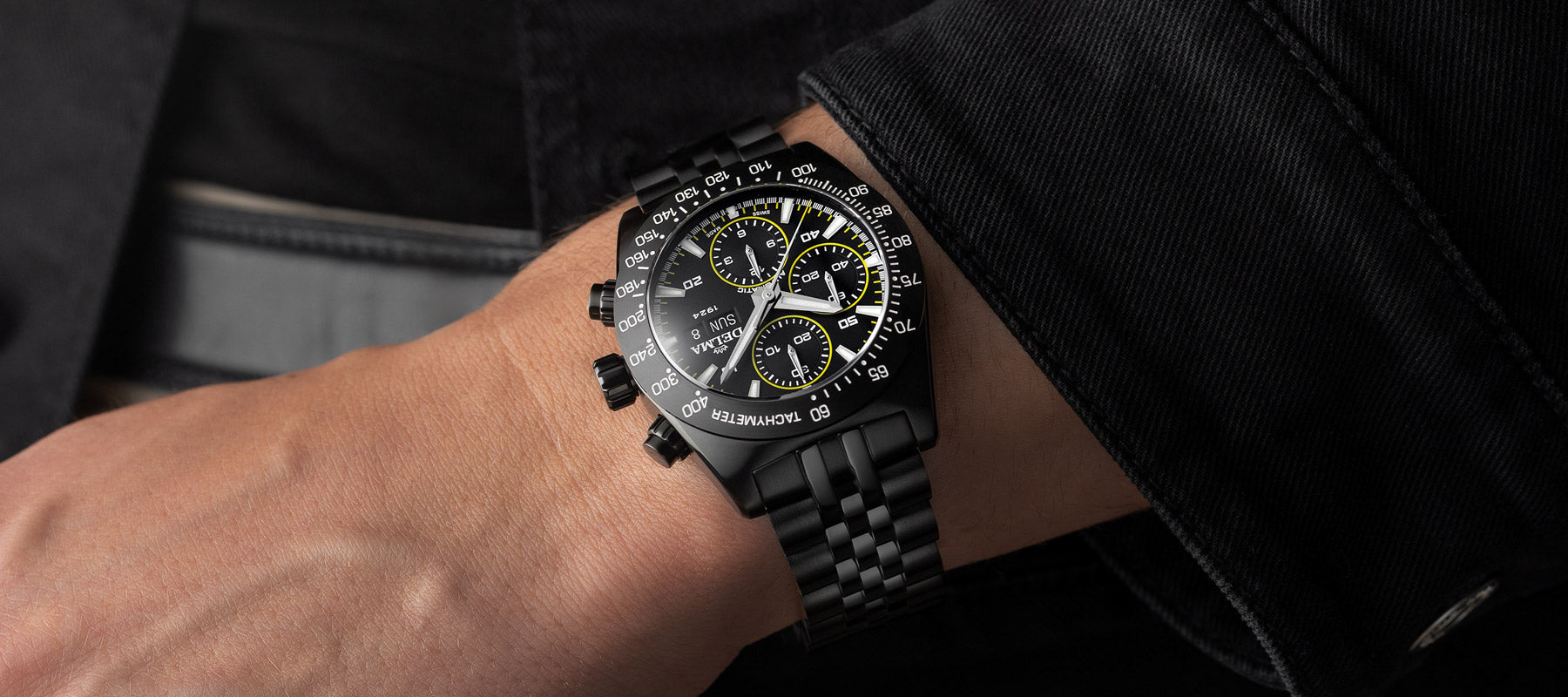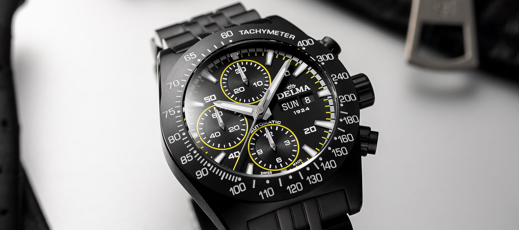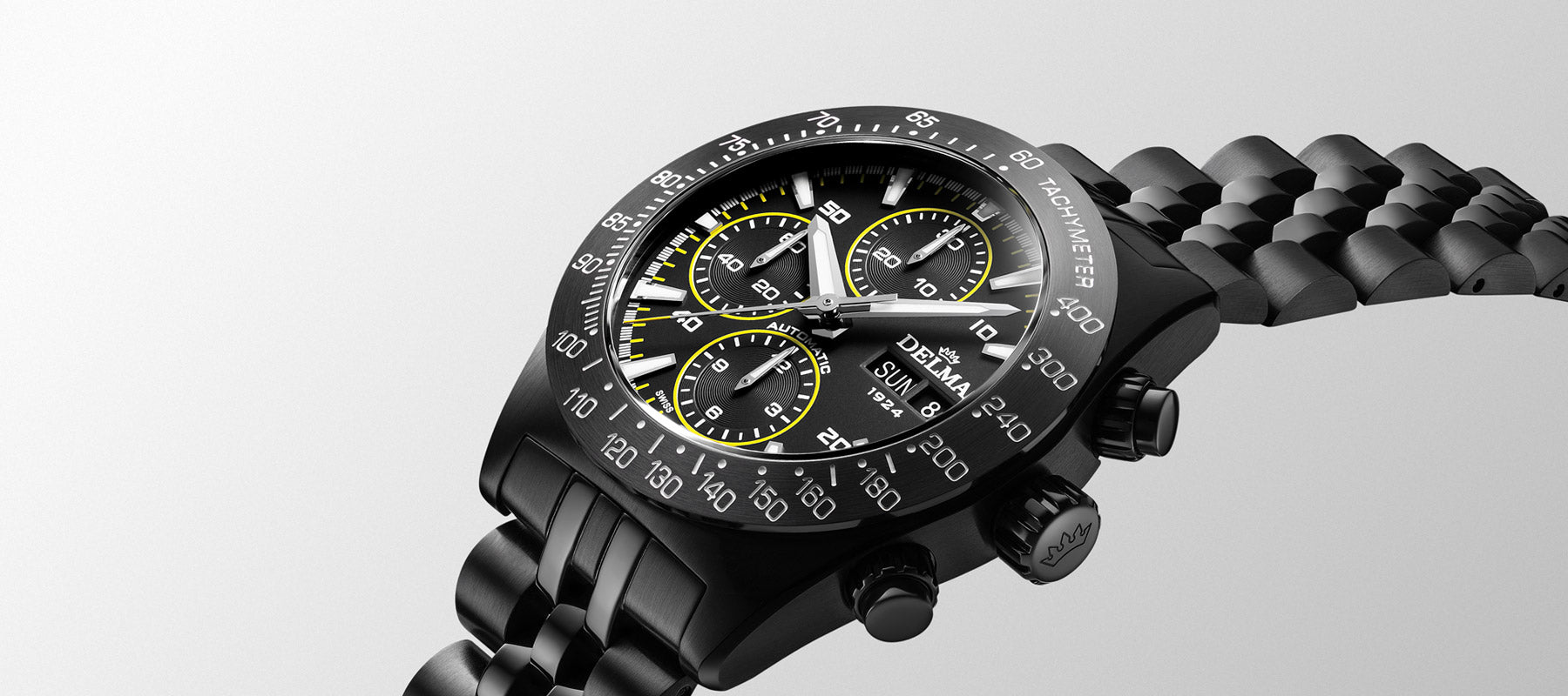 A fixed DLC bezel prominently hosts the tachymeter, ideal for measuring speed, while the black sunray-brushed dial and circular guilloche chronograph sub dials feature striking yellow accents. A day-date display and the DELMA logo add refined detail. Powered by the reliable SW500 automatic movement with a 62-hour power reserve, the watch showcases a Côtes de Genève finished rotor through its transparent case back. A screw-down crown and robust five-link black DLC bracelet complete the durable design.